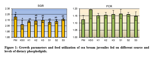 Juvenile sea bream (Sparus aurata) (initial weight 12.05 ± 0.41g) kept in triplicate tanks were fed 8 experimental diets differing in the source and level of phospholipids. A high-FM (62% FM, FM) diet was used as a positive control, and a low-FM diet (10%, KS0 diet) as a negative one. Two different sources of phospholipids (marine-krill oil; K) and (vegetable-soya lecithin; S) were added to the low FM diet at 3 inclusion levels, namely 0.5%, 1% and 2% for K1-S1, K2-S2, K3-S3 diets, respectively. All diets were isonitrogenous and isolipidic with 48% protein and 18% fat. Diets were fed to the fish ad libitum in two meals/day for 10 weeks at water temperature 25.2±10C. At the end of the trial fish were individually weighed for growth parameters determination. Samples were taken for analyses of whole body composition, fatty acids profile and histological examination.