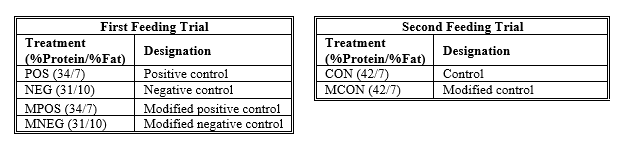 For the second feeding trial, the results confirmed the previous feeding trial results on POS and MPOS (Table 2). Additionally, the Protein Efficiency Ratio (PER) of MCON was significantly higher than CON treatment.