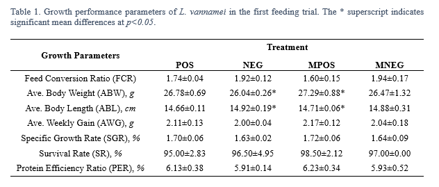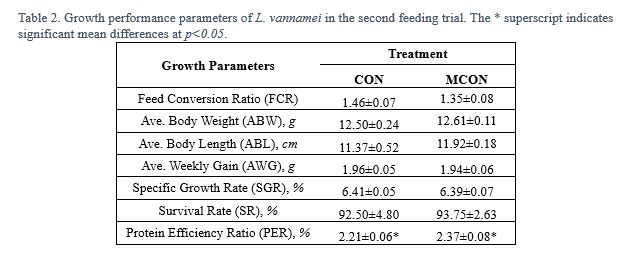For the first feeding trial (Table 1), the MPOS treatment had significantly higher body weight than the NEG treatment. Other parameters did not show significant differences among the treatments. It is also noteworthy that the MPOS showed better growth performance tendencies, although not significant.