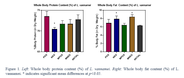 In terms of whole body protein (Figure 1, left), NEG treatment had an expectedly significant lower body protein content (%) compared to other treatments and the initial body protein, indicating low protein assimilation from a low protein diet. This effect was mitigated by the modification of the NEG diet (MNEG). For the whole body fat content (Figure 1, right), there was an expected significant increase of whole body fat of treatments NEG and MNEG. It appears that diet modification did not decrease the body fat of the shrimps.