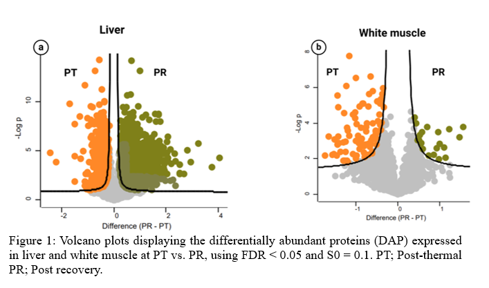 In the RAS, p roteomic analysis of the liver and white muscle identified ~6900 and ~1900 protein groups, respectively. Statistical analysis (FDR < 0.05) of the liver and white muscle proteomics data identified 2614 and 119 differentially abundant proteins (DAPs), respectively, between the two timepoints (Figure 1). When comparing simulated with natural summer, 3983 and 357 DAPs distinguished RAS from the pen . In the RAS, gene ontology analysis of the liver identified terms related to protein folding, SERPINh-1, and lactate metabolism among the proteins increased in the post-thermal group, and lysosomes, ribosome biogenesis, and unsaturated fatty acid biosynthesis in post-recovery. In white muscle, glucose and pyruvate metabolism, were enriched in both timepoints , with protein folding enriched only at post-thermal . In the pen, gene ontology analysis revealed shared cardinal markers (SERPINh-1), and mechanisms (endoplasmic processing, protein turnover) related to thermal stress with the RAS, while immunomodulatory proteins of innate and humoral responses were enriched only in the pen, capturing the different nature of commercial environment.