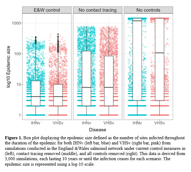 This study found significant differences in disease dynamics throughout the England & Wales aquaculture network, with IHNv epidemics resulting in larger and more costly epidemics than VHSv. For instance, the average overall cost of a IHNv epidemic was 26% higher than an VHSv epidemic under the current control measures in England & Wales. Control measures were, however, shown to similarly prevent the spread and impact of both diseases, notably with a significant decrease in the size, duration and cost of the epidemics. Subsequently, the importance of specific disease control measures, particularly contact tracing, catchment controls and fallowing period were shown. Key disease characteristics, such as seasonality and virus decay rate in sediment, were identified as primary drivers of these differences in transmission and impact.