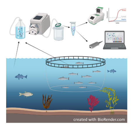 Specific and sensitive tools for detecting and monitoring pathogens in the aquatic environment can be crucial for preventing the spread of infectious agents in aquaculture facilities. Monitoring waterborne pathogens through water filtration and subsequent detection using target-specific (RT-) qPCRs and/or sequencing is an approach that can reduce or even replace the need to euthanize fish for monitoring purposes in aquaculture, allowing earlier biosecurity- and disease control measures.