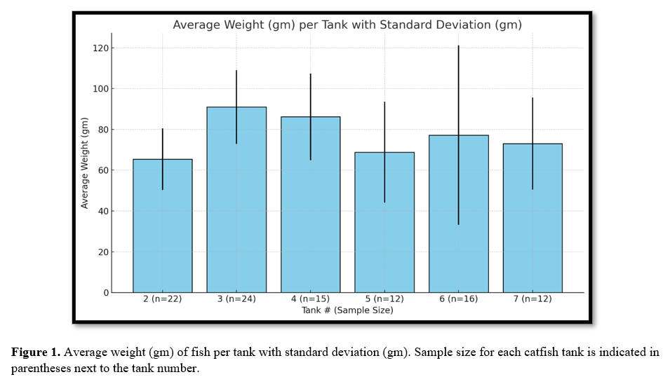 Preliminary results from the cat fish showed an average weight of 56.74 ± 15.71gm (Figure 1) . Lettuce growth displayed an average weight of 17.76g ± 9.85gm. These findings suggest that the aquaponic system facilitates effective nutrient transfer from the fish tank, promoting lettuce growth. Future research will compare these results to soil-grown lettuce and pond-grown fish to evaluate which method produces higher growth and yields, providing insights into sustainable agricultural practices for both leafy greens and fish production.