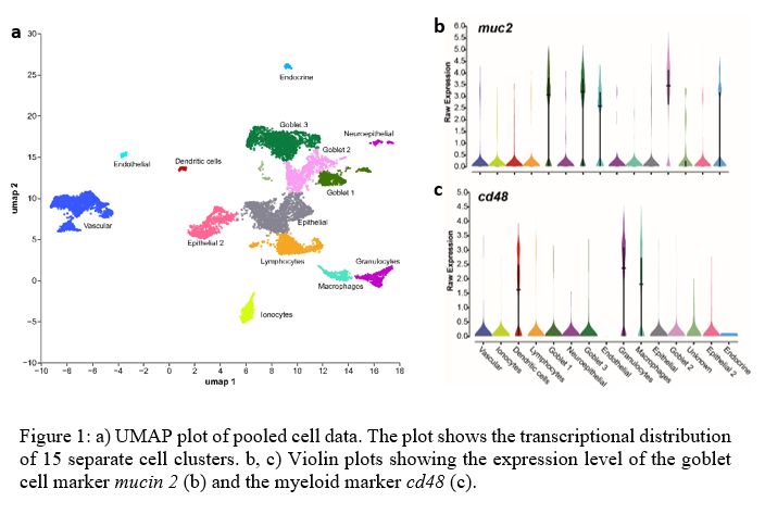 This work provides the first transcriptional atlas at single cell resolution of the healthy gilthead seabream gill. We had broadly described 15 different populations based on marker gene expression and GO analysis. Further subclustering of the largest populations will provide markers and the transcriptional profiles for cell subtypes.