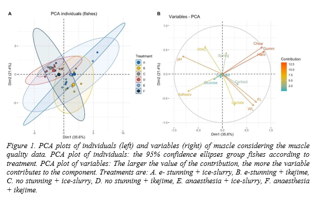 Conducted at the Estação Piloto de Piscicultura de Olhão (EPPO) in Portugal, this study involved 32 adult gilthead seabream. Fish were housed in three controlled outdoor tanks and acclimatized for 7 days before bio-loggers were surgically implanted to monitor heart rate and internal temperature. After a recovery period, the fish were subjected to various stunning and slaughter treatments: electrical stunning, anaesthesia, or no stunning, followed by either ice-slurry or ikejime. Physiological and behavioural data, including heart rate, blood samples, and muscle quality parameters, were collected. Data were analysed using linear mixed models (LMM) for heart rate, internal temperature and blood parameters, one-way ANOVA for muscle quality, and PCA for muscle quality and plasma datasets.