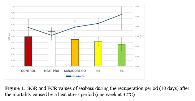 As conclusion of the study, it can be pointed out that seabass subjected to heat stress (temperature above 30ºC) and fed HeatPro diet showed better SGR, FCR, cortisol, lactate and glucose plasma levels than the fish fed control diet. On the other hand, fish fed Sanacore diet showed significantly lower MDA values than the fish fed control diet. Molecular findings suggest that the supplementation with HeatPro enhances stress tolerance and physiological resilience in seabass under high-temperature conditions.