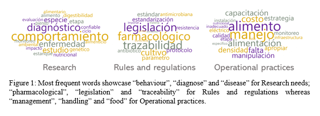 Participant’s answers in the developmental stages category highlighted three latent topics: 1) animal-based welfare indicators, 2) feeding strategies, and 3) sanitary conditions. Frequent terms across dimensions included “food”, “stress” and “mortality”, while “cannibalism” was related to early life stages. Reproductive stage emphasized “spawning”, “stress” and “females”, while grow-out stage featured “feeding” and “sanitation”. When comparing different culture systems, the main topics of GN were: 1) the availability of appropriate quality food, 2) food distribution, and 3) feeding strategies, using “distribution”, “food” and “bottom” as more frequent words. The main topics identified in A H dimension were: 1) water quality and density, 2) environmental variables and 3) predator entry to the facility. The words “density” and “environmental” and “predator” were prevalent in all categories. The GH dimension featured: 1) availability of veterinary healthcare, 2) water control, 3) disease control and appropriate diagnose, as main topics. The most frequent words used within these topics included: “difficulty”, “diagnose”, “control”, “pathogen” and “presence”. Recirculating Aquaculture Systems included “correct”, “veterinary” and “treatment”, whereas the floating cages systems related more to “presence”, “environmental” and “disease”. The AB dimension answers , according to culture systems, showed: 1) behaviour assessment, 2) appropriate facilities and 3) natural behaviour in production; as the most relevant topics. Wo rds choice indicated general and ambiguous responses, suggesting limited participant knowledge. Main topics in the slaughter methods category featured : 1) c apacity building, 2) avoid stress, suffering and pain during procedures, 3) procedures in tanks may cause suffering and stress. “T raining” (as in capacity building) was the leading word across responses and dimensions. The GN included words such as “fastening” and “stress”. The words “t ank” and “overcrowding” appeared recurrently in AH . AB included “method” and “protocol”, whereas GH included “stress”, “suffering” and “pain” . Slaughter methods featured words as : “type”, “adequate” “concentration” ( for anaesthesia) ; “need”, “effectiveness” and “training” (electric shock) ; “suffering”, “procedure” and “protocol” ( for ice). The responses to species-specific problems showed the need to develop welfare indicators based on the animal. It showcased topics such as 1) nutritional needs, 2) species- specific behaviour, 3) feeding strategies and 4) disease diagnose. The n eeds for research include: nutrition and feeding, behaviour, stress, water management and environment. Rules and regulations should address key aspects on: food, production facilities, animal health, capacity building and environmental impact. Operational practices showed: management and animal handling, standardized protocols, personnel training and comprehensive guidance documents . The most frequent words used are displayed in Fig.1.