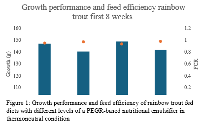 Inclusion of a nutritional emulsifier based on PEGR helped maintain growth and feed efficiency under heat stress conditions in rainbow trout. This suggests that such emulsifiers can be a valuable nutritional strategy to improve resilience in aquaculture systems facing rinsing temperatures and heat stress, maintaining production to reasonable levels.