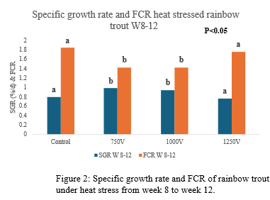 A 12-week feeding study was conducted at the trial facilities of ABT Innovia in Malta with a total of 600 rainbow trout (initial weight 111.77g) . Fish were randomly assigned to twelve tanks across four dietary treatment groups: Control, 750 ppm PEGR-based nutritional emulsifier (Volamel Extra produced by Nukamel BV, the Netherlands - 750V), 1000 ppm nutritional emulsifier (1000V) and 1250 ppm nutritional emulsifier (1250V). Fish were fed their respective experimental feeds as 4.5 mm pellets three times daily, at a fixed rate based on body size. Water temperature was maintained at 16 ± 2°C during the first eight weeks of the trial, and then gradually increased by 1°C per day to a final temperature of 22 ± 2°C to induce heat stress . Growth performance and health parameters were monitored and statistically analyzed with ANOVA, using post-hoc multiple comparisons with Tukey HSD test.
