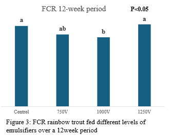 For the overall 12 weeks trial period, 1000 ppm of nutritional emulsifier showed a significant improvement in the FCR (p<0.05) and a trend towards higher growth (p=0.1). Survival and K-factor (condition factor) were unaffected across treatments.