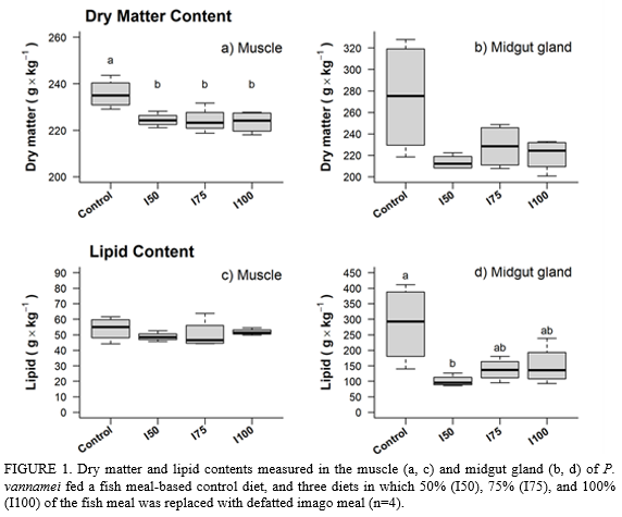 Full fat imago meal contains 52% protein, 36% lipid, and moderate levels of chitin (5%). Considerable amounts of amino acids are present with an essential amino acid index of 1.8, referring to the ideal protein for penaeid shrimp (NRC, 2011). Cholesterol and copper were detected at moderate concentrations of 2.8 g·kg-1 and 16 mg·kg-1, respectively. Defatting the imago meal (IM) reduced the lipid content to 23% and increased protein levels to 60%. Results of the digestibility trial showed, that defatting significantly increased the bioavailability of protein and energy (p < 0.05). This is likely related to the low tolerance of shrimp to high levels of dietary lipids and the high content of saturated fatty acids present in imago meal (NRC, 2011; Glencross et al., 2002). However, protein and energy apparent digestibility remained moderate in defatted IM with approximately 60% and 53%, respectively. The acceptability of the defatted IM containing diets was reduced, leading to significantly lower apparent feed intake of the I75- and I100-diets during the growth experiment (p = 0.001). Shrimp growth was reduced in all defatted IM-containing diets (p = 0.0005). Defatted IM-containing diets caused lower dry matter contents in shrimp muscle (p = 0.0136) and lower lipid contents in midgut glands compared to the control diet (p = 0.0169; FIGURE 1).