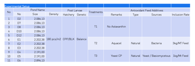 From Day of Culture (DOC) 30 to DOC 101, the experimental design involved administering astaxanthin-enriched feed exclusively to Treatment 2 and Treatment 3 ponds, while the control ponds continued to receive standard feed. Comprehensive data collection was implemented as follows: