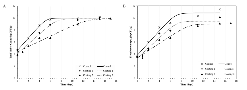 Figure 1 presents the growth curves of TVC and Pseudomonas spp. fitted to the Baranyi Growth Model. The curves did not exhibit a lag phase. The initial load for TVC was 4.37, with no statistically significant differences between the three tested groups. Similar values have been reported by Koutsoumanis et al. (2002) and Spanou et al. (2024) as the initial microbial load of Mediterranean species. Control samples exhibited the highest growth rates for TVC and Pseudomonas spp. (1.01±0.16 d-1 and 1.01±0.13 d-1, respectively). The growth rate of samples treated with coating 1 was 0.81±0.04 d-1 for TVC and 0.86±0.01 d-1 for Pseudomonas spp. Samples with coating 2 had a growth rate 0.44±0.02 d-1 for TVC and 0.60±0.02 d-1 for Pseudomonas spp. The maximum load of TVC ranged between 9.85-9.97 logCFU/g and 8.99-10.81 logCFU/g for Pseudomonas spp. According to Alexi et al. (2022) the limit of fish acceptability can be considered as 7 logCFU/g for TVC. Based on this limit, the shelf life of control samples was 2 days. The shelf life of samples treated with coating 1 was 4 days and the shelf life of samples treated with coating 2 was 6 days.