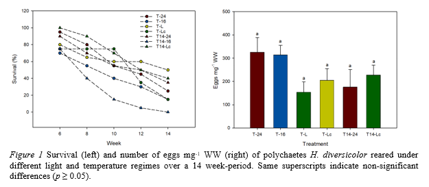 With the progression of maturation, the survival of H. diversicolor decreased across all treatments over time due to its semelparous life history (Hartmann-Schröder et al., 1996). Individuals in the 16L:8D light treatment group, in both natural temperature conditions and at 14°C showed the most rapid decline in survival. Correlating this decline with the onset of reproduction and higher reproductive success in terms of offspring numbers will be crucial for understanding these results, however, this is yet to be evaluated. Variation and light did not affect the final egg mg-1 count (one-way ANOVA, p ≥ 0.05), suggesting no difference in retention of eggs in the coelom.