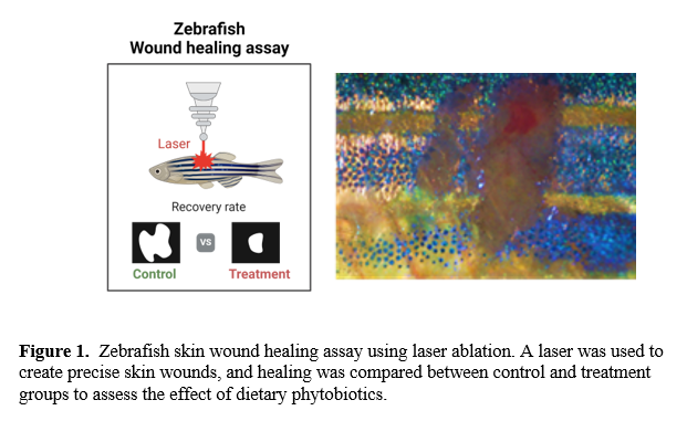 Zebrafish (Danio rerio ) have become a widely recognized model for studying vertebrate skin regeneration due to their rapid wound closure ability. Recently, a new laser ablation method has provided precise and reproducible control over wound size and depth, further enhancing experimental consistency. The present study utilized the laser ablation model in adult zebrafish to evaluate the efficacy of phytobiotic-based dietary additives in accelerating wound healing and promoting efficient skin regeneration.