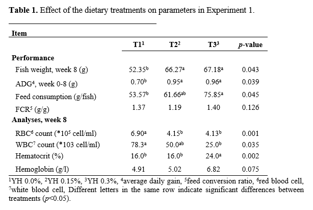 In E1 (Table 1), dietary YH significantly increased average daily gain, fish weight on the final day, and feed intake. Feed conversion and mortality were similar in all treatments. Hematocrit was increased by YH, while YH significantly decreased the red and white blood cell counts. The treatments did not significantly affect serum protein concentration, immunoglobulin M, glycogen, lysosome activity, glutathione, or foregut villus length.