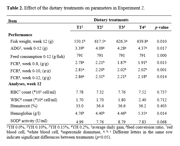 In E2 (Table 2), YH significantly and dose-dependently improved the average daily gain, and also increased fish weight at 12 week. Feed conversion was significantly improved by dietary YH amendment. Mortality was 0% in all treatments throughout the experiment. Hematocrit, serum protein concentration, mean villus length, lysozyme activity and glutathione were all unaffected by the dietary treatments. The SOD activity tended to be higher for YH-treated groups than the control group (p=0.068). Carcass composition and foregut villus length were not affected by the dietary treatments.
