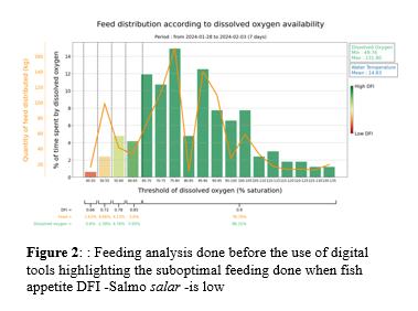 By analyzing farmer’s state of the art, we can estimate how much feed is given into suboptimal period (Figure 2) and asses the margin of improvement. The Figure 2 below illustrates a pre-deployment analysis in Chile, wh ere 21.2% of the feed is given outside the optimal periods, resulting in feed waste, inefficient productivity, economic loss and unnecessary environmental impact.