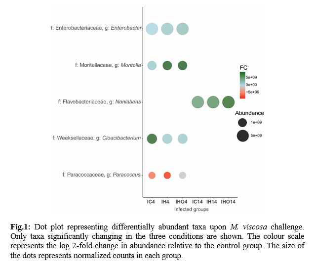 Bacteroidota was the most abundant phylum among all groups, constituting more than 29.4% of the total bacterial abundance in salmon skin, followed by Pseudomonadota (21.9%), Actinomycetota (18.7%), and Bacillota (6.9%). Interestingly, no significant differences were found in the alpha and beta diversity between the different tested conditions (C, H, HO). However, the genera Staphylococcus, Enhydrobacter, and Chryseobacterium were significantly higher when comparing the H and HO groups with the C group. On the other hand, the bacterial challenge drove significant differences in beta diversity, where several genera, including Moritella, significantly changed their abundance between the two sampling points (Fig.1). Interestingly, the abundance of this genus shifted over time, dramatically decreasing in the 14-day sampling, leading to the overgrowth of other taxa such as the genus Nonlabens from the family Flavobacteriaceae.