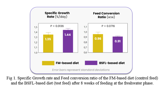 Defatted Black Soldier Fly Larvae (BSFL) meal from Innovafeed replaced 50% of fishmeal in the test diet (corresponding to a 10% inclusion), which was otherwise iso-proteic and iso-energetic to a fishmeal/SPC control. 100 juvenile Atlantic salmon (17.5g initial weight) per tank (n=4 replicates/diet) were fed to satiation 4 times daily for 8 weeks. Feed intake, g rowth (initial and final weight, SGR, FCR), mortality, and VSI (5 fish/tank at termination) were measured. All parameters were assessed for normality and homogeneity of variance prior to statistical analysis. Subsequently, comparisons were performed using a Student’s t-test.