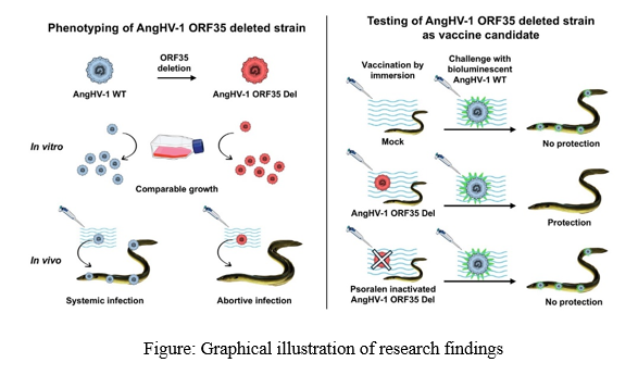 Anguillid herpesvirus 1 (AngHV-1) (recently renamed Cyvirus anguillidallo 1) is the etiologic agent of a lethal disease that affects several eel species. It is thought to be one of the main infectious agents causing a population decline in wild eels and economic loss within the eel aquaculture sector. Since the first report of AngHV-1 in the 1980s, it has been detected globally, affecting different anguillid eel species from temperate to tropical countries. To date, there is no vaccine against AngHV-1 available on the market. Current measures to prevent AngHV-1 disease within aquaculture settings mainly rely, when possible, on shifting water temperatures outside of the range (below 22 °C) associated with efficient lytic replication. However, it promotes latent infection thereby increasing the risk of transmission when latently infected eels are cohabiting with naïve eels under stressing conditions. Recently, we developed an attenuated recombinant vaccine against CyHV-3 using prokaryotic recombination technologies and in vivo bioluminescent imaging system (IVIS). The development of this vaccine relied on the deletion of CyHV-3 ORF57. Orthologues of CyHV-3 ORF57 exist in CyHV-1 and CyHV-2 (ORF57) and in AngHV-1 (ORF 35). Therefore, this study demonstrates the effect of ORF35 deletion on the ability of AngHV-1 to replicate in cell culture and on its virulence after inoculation in European eels (yellow eel stage) by different routes.