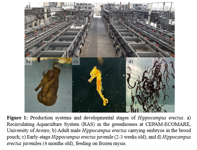 Seahorses are unique marine fish species renowned for their distinctive morphology and reproductive behaviour . Due to their high commercial value and conservation concerns, seahorse aquaculture has gained attention as a sustainable alternative to wild collection. However, the successful maintenance and cultivation of seahorses, especially during their early life stages, presents numerous challenges. This study at CEPAM-ECOMARE (University of Aveiro, Portugal) aims to investigate key factors in the rearing of seahorses, namely Hippocampus erectus , including water quality, food supply, and tank management, to improve survival and optimize commercial production.