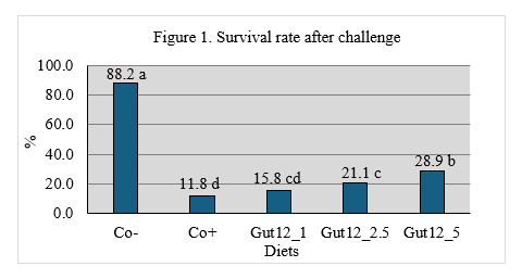 In a four-replicate setup, five treatments were investigated , including two control groups and three test groups with 30 shrimp ( average initial weight of 1.53 ± 0.07 g) per replicate. The controls included an unchallenged negative control (Co-) and a positive control (Co+) challenged with AHPND. The test groups were also challenged and fed a diet supplemented with test product at dosages of 1.0 (Gut12_1), 2.5 (Gut12_2.5), and 5.0 (Gut12_5) g/kg Marfeed Gut12 . The 27-day trial comprised a 2-day acclimation period, 14 days of pre-challenge feeding, a 1-day VP challenge, and a 10-day post-challenge observation phase. The challenge was conducted via immersion in water by an LD50-60/96-120 h dose of VPAHPND for all diets, excluding the negative control group. Shrimp survival rates were assessed post-challenge eight times per day . At the end of the challenge, qPCR was used to measure VP quantities in the HP, with samples taken from three shrimp per tank. Data analysis through one-way ANOVA revealed statistically significant differences between mean values at p < 0.05.