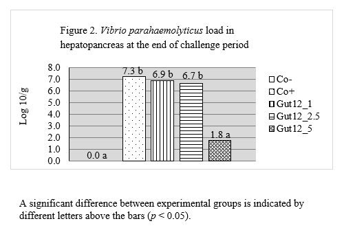 Whiteleg shrimp (Litopenaeus vannamei ) have experienced rising production over the past decade, but intensified farming has led to increased susceptibility to diseases such as acute hepatopancreatic necrosis disease (AHPND). This , caused by Vibrio parahaemolyticus (VP), severely impacts the hepatopancreas (HP) , a key organ for metabolism and immunity . This infection can be detected through the dissection of shrimp HP, where typical signs include a pale appearance and organ atrophy. Due to the economic losses caused by AHPND for shrimp farmers, the use of antibiotics to prevent and treat this infection is common in developing countries. However, the misuse of antibiotics has caused microbial resistance, which poses a significant global threat by reducing the effectiveness of disease treatments. To combat this, alternatives to antibiotics have been explored in shrimp such as essential oils , mannanoligosaccharides and β-glucan, which strengthen shrimp immunity. Additionally, glycerol fatty acid esters have shown antimicrobial properties against Vibrio pathogens. The aim of this study was to evaluate whether a combination of dietary immunomodulators (Marfeed Gut12) can improve the immune resistance of whiteleg shrimp against VP and at which dosage.