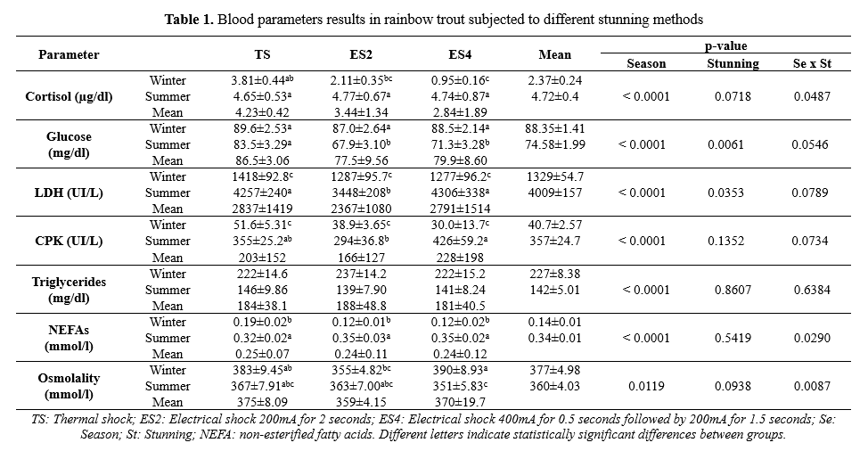 A total of 180 pan-size rainbow trout (349 ± 4.11 g ) were assigned to one of three stunning methods: Thermal shock (TS) through 32-minute ice-water immersion, dry electrical stunning at 200mA for 2 seconds (ES2), and dry electrical stunning at 400mA for 0.5 seconds, followed by 200mA for 1.5 seconds . Both electrical stunning treatments were followed by a 32-minute ice- water immersion . After stunning, blood samples were analyzed for cortisol, osmolality, and energy metabolism markers (glucose, LDH and CPK enzymatic activity, triglycerides, and NEFAs). The trout were then slaughtered, and muscle samples were collected for histological analysis . The trial was conducted in winter (8.67 ± 0.04°C ) and summer (22.3 ± 0.04°C). Data were analyzed using GraphPad Prism 10.3.1, with normality and homogeneity assessed via the Shapiro-Wilk and Bartlett’s tests. A two-way ANOVA was conducted, followed by post -hoc Tukey’s test (p < 0.05).