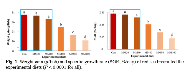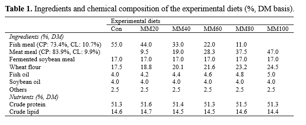 FM up to 40% could be replaced with MM in a 55% FM-based diet without significantly impairing the growth performance and feed utilization of juvenile red sea bream.