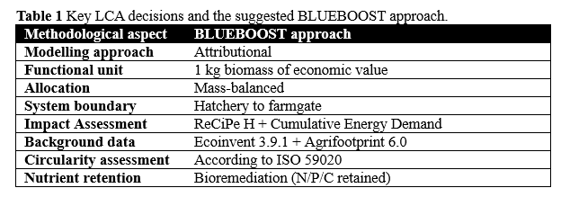 The four IMTA LCA studies all focus on different systems and, most importantly, use different LCA method decisions . Functional units varied considerably, i.e. the output of the system which environmental pressures are related to – and which has a strong effect on results. Further, how to allocate environmental burdens between main product and co-products and choice of impact assessment method (and environmental impact categories included) also matter for results on IMTA system performance. Comparability of results between studies is therefore limited without harmonization . The key method choices suggested for BLUEBOOST are found in Table 1.