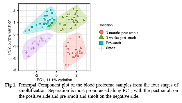 Blood samples were collected from a single cohort of Atlantic salmon at four developmental stages: pre-smolt, smolt, 3-week post-smolt, and 3-month post-smolt. Proteomic analysis identified ~ 3,500 proteins per sample, with 2,588 proteins retained for differential expression analysis. Principal Component Analysis (PCA) was performed to distinguish developmental stages based on proteome signatures. Weighted correlation network analysis (WGCNA) identified protein modules with stage-specific expression patterns. Gene Ontology (GO) and KEGG pathway enrichment analyses characterised the biological processes and pathways altered during each developmental transition.