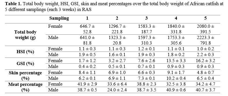 Table 1. Total body weight, HSI, GSI, skin and meat percentages over the total body weight of African catfish at 5 different samplings (each 3 weeks) in RAS
