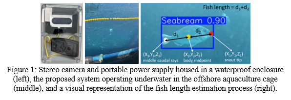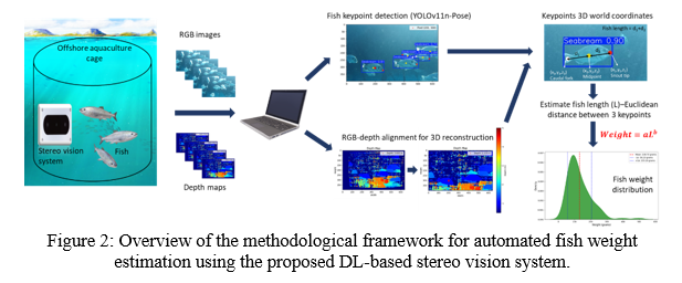 The proposed system consists of a Luxonis OAK-D PoE stereo camera and a PoE-48V portable power supply, both housed in a waterproof enclosure (Figure 1, left panel). The camera captures synchronized RGB and depth images at 20 frames per second (FPS) and operates within a depth sensing range of 0.7 to 12 meters. The system was deployed in a commercial offshore aquaculture cage managed by Kimagro Fishfarming Ltd. (Figure 1, middle panel) stocked with Mediterranean gilthead seabream (Sparus aurata), following an underwater calibration procedure to optimize the camera parameters. During the field study, the system was suspended 2 meters below the sea surface and recorded continuously for 30 minutes, resulting in 291 RGB-depth image pairs. Simultaneously, 220 fish were manually weighed (mean weight=122.91 g, standard error of the mean (SEM)=1.69 g) to provide ground truth (GT) data. The weighed fish were isolated with a splitting net in the cage to ensure accurate correspondence between estimated and measured weights. Three anatomical keypoints—the snout tip, body midpoint, and middle caudal rays—were detected on the fish body in RGB images using the DL model (YOLOv11n-Pose) and subsequently aligned with corresponding depth data to enable 3D reconstruction of the fish body. Fish length was computed as the Euclidean distance between the three identified keypoints (Figure 1, right panel) and converted to weight using a species-specific empirical length–weight relationship: 𝑊=0.0123𝐿3.0284 (Mehanna, 2007). An overview of the proposed methodological framework is presented in Figure 2.