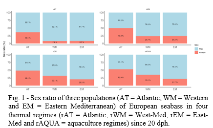 With global warming, the surface temperature of the Mediterranean Sea has increased by 0.4 °C per decade from 1985 to 2006 (Nykjaer, 2009) and is projected to increase further by 2.2 to 3.4 °C until 2080 (IPCC, 2021). The European seabass, Dicentrarchus labrax, is very important for both aquaculture and fisheries in the Mediterranean. One of the big challenges in seabass farming is to improve the sex ratio in favour of the females, which grow faster and mature later. Moreover, seabass has a polygenic sex determination system with environmental influences, mainly driven by temperature (Vandeputte and Piferrer, 2019). Therefore, studying the impact of changing temperature on sex ratio is crucial for seabass production. In this study, we investigated the sex ratio and sexual dimorphism of three natural populations: Atlantic (AT), Western Mediterranean (WM) and Eastern Mediterranean (EM) in different thermal regimes.