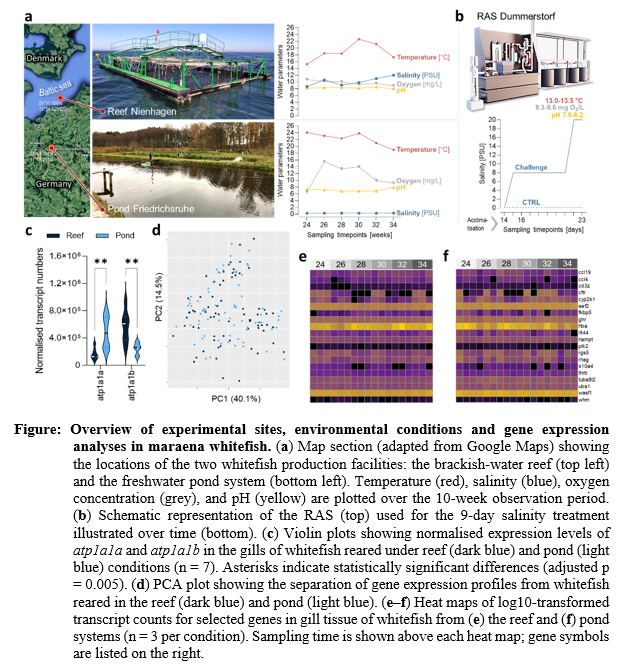 Despite the growing body of research on osmoregulatory markers in salmonids, transcriptional indicators of saltwater tolerance in coregonids remain largely unexplored. To address this gap, we profiled gene expression in selected tissues of maraena whitefish Coregonus maraena reared either in the Baltic Sea with naturally fluctuating salinities or in a freshwater facility (see Figure a) . Acknowledging the influence of variable environmental conditions in these two open aquaculture systems, we also conducted a complementary salinity challenge under standardised conditions in a recirculating aquaculture system (RAS).