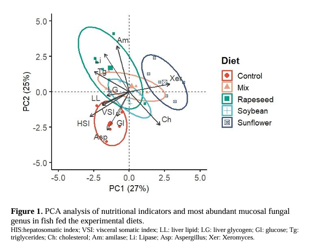 Growth, feed efficiency, and body composition were unaffected by diet composition. Gut morphology showed minimal changes, except for reduced goblet cells and increased supranuclear vacuolization in fish fed the soybean diet. Fish fed the sunflower diet exhibited the lowest hepatosomatic index (HSI), liver lipid and glycogen levels, and plasma glucose. Plasma triglycerides were higher in soybean and rapeseed groups, while plasma cholesterol was higher in soybean and sunflower groups. Amylase and lipase activities were higher in fish fed the rapeseed diet. The mucosal microbiome, particularly the fungal community, was affected by dietary treatment. A comprehensive evaluation of the results is provided in Figure 1.