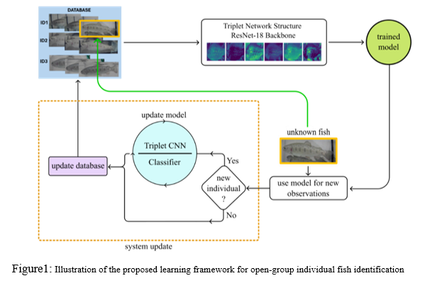 The proposed system utilizes a triplet network with a ResNet-18 backbone for individual identification of trout. This method employs an incremental learning strategy, enabling the system to add new classes of individuals to update the model and database progressively. The model is trained from scratch on a dataset including five known individuals. After each training cycle, t he model compares newly observed individuals with the existing database, adding into the individual’s set if a match is found or assigning the image as a new class in case no match is detected. The model is continuously retrained after each cycle of database update with the transferred weights from the previous phase and improves the generalization ability effectively. A thresholding strategy is employed to balance the trade-off between confidence in matching and the risk of class fragmentation of the same individuals . This framework supports few-shot learning, enabling robust re- identification for limited observations.