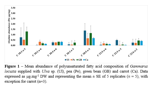 The fatty acid composition of G. locusta clearly reflected their diets . Amphipods fed Ulva sp. showed higher levels of eicosapentaenoic acid (EPA) (C20:5n-3) (Ul: 1.3 9 ± 0.15, Pe: 0.70 ± 0.18, GB: 1.15 ± 0.32 and Ca: 0.68 ± 0.09, µg/mg DW) (Figure 1) . However, in the case of docosahexaenoic acid (DHA) (C22:6n-3) , amphipods fed Ulva displayed lower values when compared to conspecifics fed plant-based diets (Ul : 0.26 ±0.07 , Pe: 0.28 ± 0.09, GB: 0.46 ± 0.08 and Ca: 0.41 ± 0.08 µg/mg DW) (Figure 1) . It is worth highlighting that amphipods fed on terrestrial plant diets (Pe, GB, Ca) exhibited both EPA and DHA, despite the absence of these fatty acids in their diets