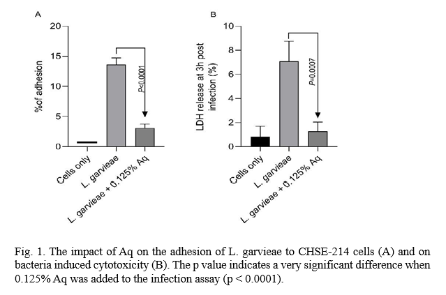 This study employed CHSE-214 epithelial cells and rainbow trout red blood cells to model infection. The MIC and MBC of Aq were determined using standard dilution techniques. The anti-virulence activity of Aq at the established MIC (0.125%) was assessed by, measuring bacterial growth, EPS gene expression , biofilm formation , cytotoxicity via LDH release , adhesion of L. garvieae to epithelial cells and gene expression of haemolysins (hly1, hly2, hly3). Immunomodulatory and inti-inflammatory effect of Aq was assessed by measuring host inflammatory cytokine responses (IL-1β and IL-8). Finally, the protective effect of Aq was measured by challenging trout red blood cells with L. garvieae and measuring haemolysis in an ex vivo assay. Gene expression was analys ed using quantitative RT-PCR, and statistical analysis was performed using t-tests and ANOVA.