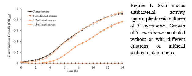 This study developed an evaluation of skin mucus antibacterial activity on planktonic cultures, on biofilm formation and on mature biofilms of Tenacibaculum maritimum (CECT 4276 strain from the Spanish Type Culture Collection University of Valencia, Spain). To do this, an experimental setup for the biofilm formation has been developed. A pool of homogenized skin mucus of gilthead seabream juveniles (S. aurata) was created and three different dilutions were tested in the antibacterial assays. The activity of skin mucus on biofilms was monitored through Crystal Violet staining (biomass) and resazurin assay (metabolic activity).