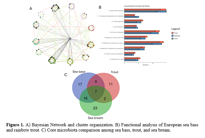 Among the microbiomes closely associated with animals, the intestinal populations represent the most abundant and biodiverse. This microbial association is also characterized by a strong inter and intra-species variability, which however came with a high functional redundancy. These two aspects together make the investigation and the prediction of the microbiota modification an ongoing challenge (Vatsos, 2017). Therefore, the definition of feasible microbial biomarkers and the understanding of the inner bacterial relationships are particularly relevant in the context of aquaculture sector, as it is broadly documented how microbiota can impact the performance and the welfare of farmed animals (Luan et al., 2023). Hence, the aim of the present study was to find similarities and differences in the gut microbial populations of three main European farmed fish (gilthead sea bream, European sea bass, rainbow trout) with focus on the functional role of the core microbiota species using a computational and Bayesian network approach .