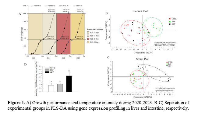 The temperature always represents a factor that strongly affects metabolic activity and growth performance of ectotherm animals. Accordingly, the rise of incidence of intense marine heatwaves and heat stress events are worsening risks for aquaculture, especially in the Mediterranean basin. However, the present results exhibited a contrary and promising trend for gilthead sea bream, because the achieved growth align with the historical water temperature records in the Mediterranean Sea along the summers of 2022 and 2023, reaching the commercial size in a 1-2 months shorter period (Fig. 1A). This important finding highlights that a correct feeding schedule is able to promote an enhanced g rowth with the water temperate rise regardless of the use of different fish feeds. Certainly, the achieved growth with the three tested diets was almost undistinguishable , and no signs of histopathological damage were found in both liver and intestine in any experimental dietary group . However, going deeper with the analyses, the transcriptomic profiles revealed different temporal metabolic strategies that clustered together different fed fish for a given particular tissue. Thus, liver and muscle gene expression patterns cluster ed together CTRL and ALT groups at the end of trial (Fig. 1B) , mostly due to the confluent expression pattern of markers of lipid metabolism and mitochondrial respiratory chain . In contrast, the differential expression pattern of immune-related genes of t he intestine clustered together CTRL and PAP fed fish (Fig. 1C). These different gene expression features also shaped a different stress response with a more reactive behaviour (increased activity) immediately after stress confinement in ALT fed fish, which rendered an enhanced activity/respiratory quotient with 2-3-fold lower plasma cortisol levels under standard basal conditions (Fig 1D). According ly, it was hypothesized that the ALT feed would avoid a chronic stress condition (improved welfare and wellbeing) , which supports at the same time a more reactive response when fish are stress challenged .
