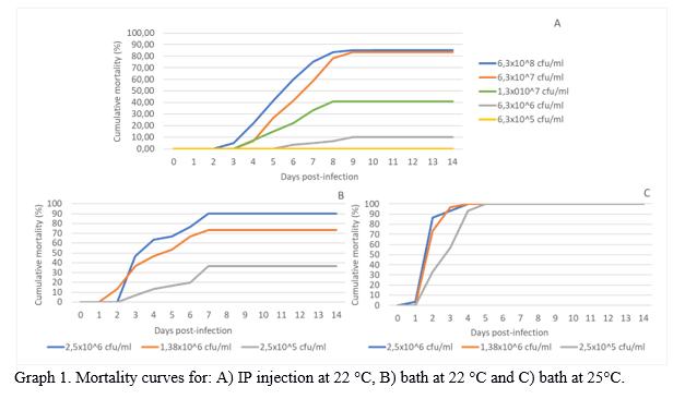 Graph 1 shows the cumulative mortality results for the different bacterial concentrations of A. veronii according to the tested route of administration and temperature.