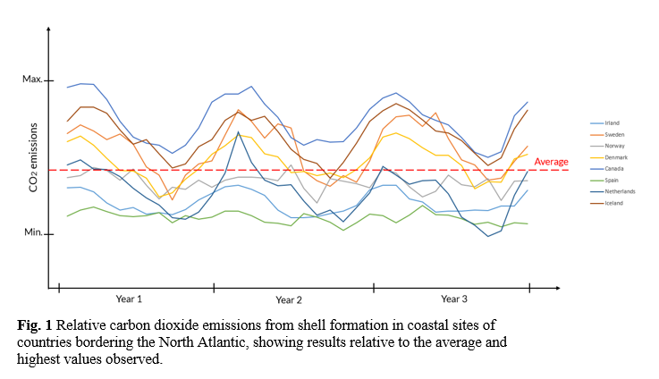 Results show considerable variability in CO2 emissions from shell formation across different sites, with Canada having the highest average emissions and Spain the lowest (Fig. 1). Emissions seem to be largely temperature-driven , as the ranking closely follows latitude. In particular, the northern latitudes show considerable seasonal variability, with higher emissions in the winter and lower in the summer , while seasonal variability in the southern latitudes is much smaller .