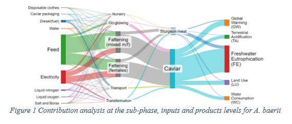 LCA results showed high variability depending on the species, e.g., Global Warming (GW) ranged between 53 and 83 kg CO2 eq/kg of caviar, Terrestrial Acidification (TA) between 0.18 and 0.29 kg SO2 eq/kg of caviar, Freshwater Eutrophication (FE) from 0.02 to 0.05 kg N eq./kg of caviar, Land Use (LU) from 43 to 93 m2/kg caviar, and Cumulative Energy Demand (CED) from 714 to 1153 MJ/kg of caviar. For all the species, the fattening phases had the highest impact contribution, ranging from 80% in GW for A. gueldenstaedtii to 94% in FE and 99% in LU for H. huso. In all cases, the inputs that collectively accounted for >95% of the impacts were feed, electricity and transportation. Figure 1 depicts the contribution analysis at the sub-phase, inputs and products levels for A. baerii. The scenario analysis showed that: i) an early genetic sex determination allows a significant reduction in the feed used with consequent decrease in impacts (e.g., up to -21% of the impacts related to Freshwater Eutrophication-FE); ii) increasing the supply of renewable energy at the farm level is effective, but to a different extent depending on the species considered (from -2% to -19 % for GW).