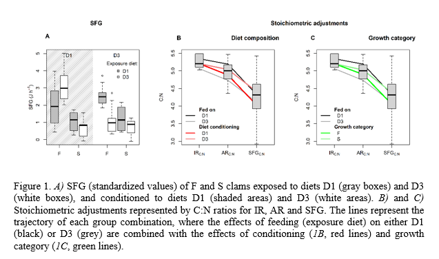 Dietary effects: Lipid-rich diets significantly enhanced SFG (Figure 1A) and elemental balances in juvenile clams. Clams conditioned to lipid-rich diets exhibited higher energy balances compared to those fed carbohydrate-rich diets. The biochemical composition of body tissues reflected the dietary content, indicating limited ability for homeostatic compensation. However, F clams showed a higher degree of tissues homeostasis.
