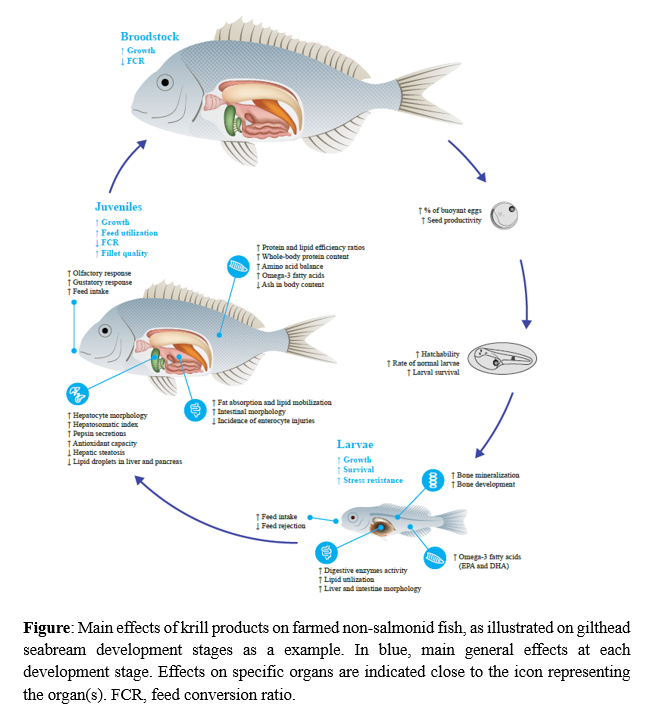 With the growing global demand for fish as a protein source, there’s increasing pressure to find sustainable alternatives to traditional aquafeed ingredients like fishmeal (FM) and fish oil (FO), which are facing reduced availability due to environmental and economic constraints. Plant-based substitutes help ease the burden on marine ecosystems but come with challenges such as anti-nutritional factors, low levels of essential omega-3 fatty acids (EPA and DHA), limited amino acid profiles, and reduced palatability—ultimately affecting fish growth, health, and product quality. Moreover, only a few crops like soybean, rapeseed, corn, and wheat are commonly used in aquafeeds, and their availability is influenced by climate change and global socio-economic factors. These plant-based ingredients also compete with human food, livestock, and pet food markets, driving up prices and limiting supply for aquaculture. Novel feed ingredients like insect meals, single-cell proteins, and fish co-products are being explored but are still limited by regulatory, cost, and scalability issues. Antarctic krill (Euphausia superba) stands out as a promising low-trophic alternative with minimal environmental impact, sustainable sourcing as it’s the most sustainable fishery, aligning with industry standards and consumer demands for eco-friendly products. Moreover, since krill is not consumed by humans, there is no competition between its use for food and feed . Further k rill-derived products mainly krill meal (KM) are rich sources of nutrients such as highly digestible proteins and lipids , phospholipids, astaxanthin, and phospholipid-bound omega-3s (EPA and DHA), which are more bioavailable than those in traditional sources and micronutrients such as organic minerals and vitamins . Further, commercially available KM is supported by extensive scientific evidence demonstrating its benefits in various fish species when included in feeds. This review consolidates current knowledge based on 22 nutritional studies from the 1980s to the present on the benefits of KM for the most important non-salmonid fish species to aquaculture, including Gilthead seabream (Sparus aurata), European seabass (Dicentrarchus labrax), Nile tilapia (Oreochromis niloticus), red seabream (Pagrus major ), Olive flounder (Paralichthys olivaceus), and yellowtail ( Seriola quinqueradiata) (Figure. 1). In addition, this review addresses the possible future perspectives on the application of krill meal in aquaculture feeds. Finally, the review addresses the key challenge of KM’s high cost, highlighting the need for comprehensive economic evaluations to assess its cost-effectiveness compared to both conventional and novel feed ingredients.