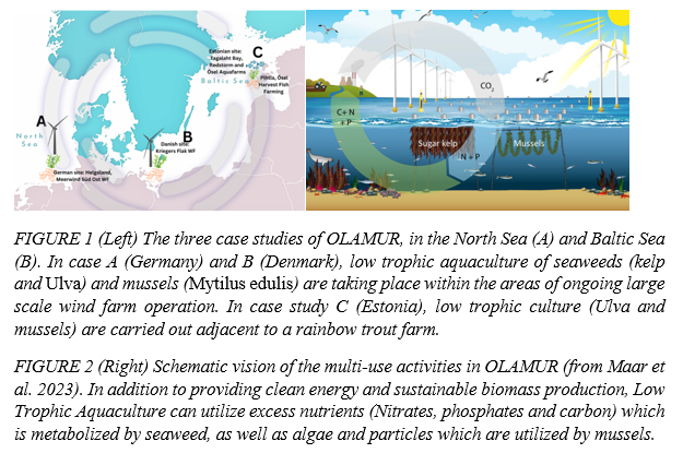 The urgent need for more efficient use of marine area, and for European energy and food security, has highlighted the potential for multi-use, i.e. the use of area for more than one purpose. The recent expansion of offshore wind power has emphasized conflicts among different stakeholders. At the same time, aquaculture of low-trophic organisms, such as bivalves or seaweeds appears an attractive way to increase biomass production. Both activities contribute to urgent European needs, for energy and food security. Bivalves can feed on microalgae and particles, and seaweeds utilize nutrients, such as nitrates, phosphates and CO2 . In the OLAMUR project, we are developing initiatives for multi-use involving low-trophic aquaculture (LTA) in the Baltic and North Seas. Now, the project is expanding with five Associated regions across different European seas.
